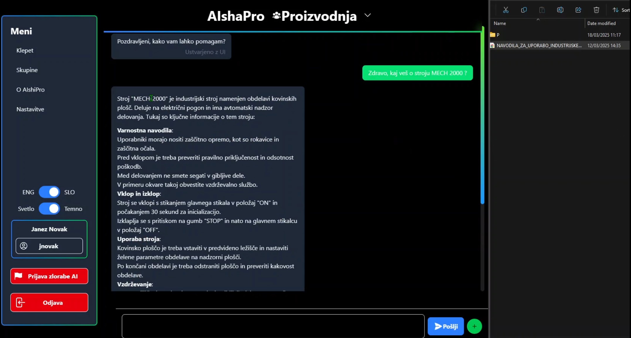 Programska rešitev AISHA je naš klepetalni iskalni pomočnik. Jezikovni model je omejen na iskanje po vaši interni dokumentaciji in dokumentih, ki jih uporablja vaše podjetje. Omogoča vam iskanje po dokumentaciji v naravnem jeziku in to v praktično katerem koli jeziku (seveda tudi v slovenščini).
